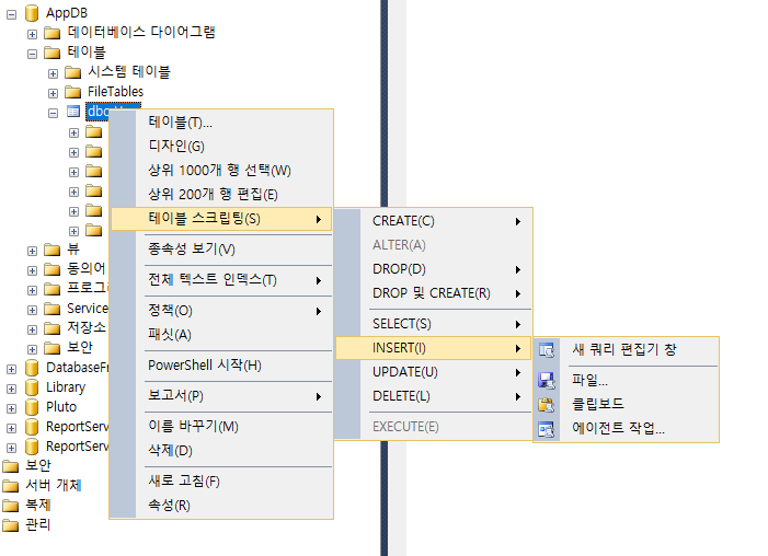 복원 시켜야할 테이블에 오른쪽클릭 > 테이블 스크립팅 > INSERT > 새 쿼리 편집기 창을 클릭하면